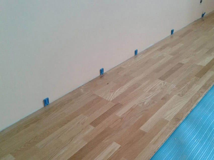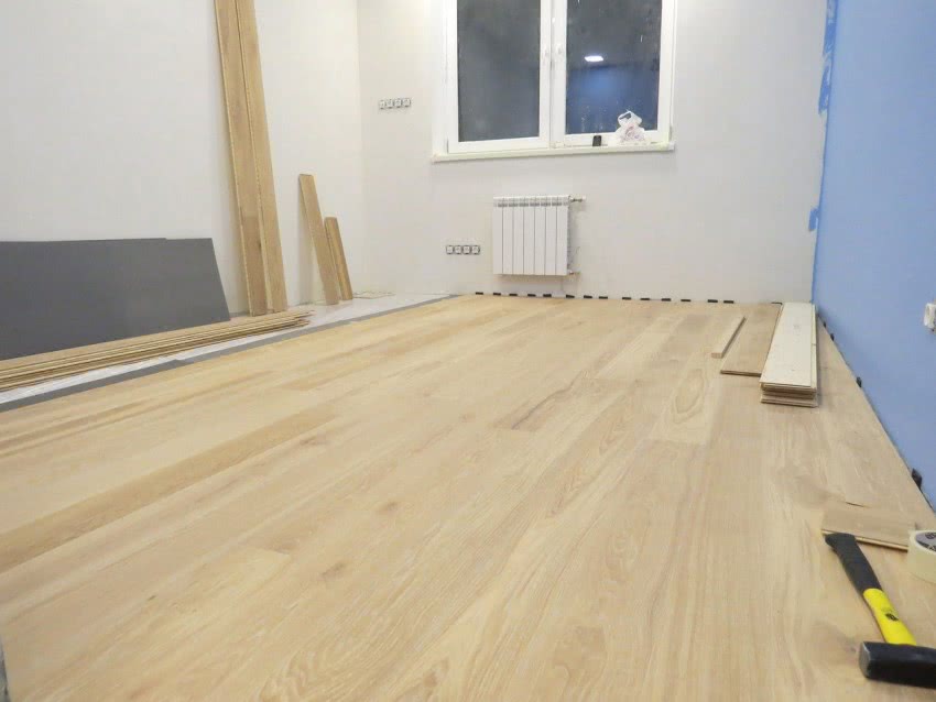 Если монтаж будет осуществляться на деревянные полы, то также проверяем их уровень. Поверхность должна быть выровнена, либо рубанком, либо циклевкой. Если очень сильные перепады, о лучше провести демонтаж старых полов и залить полы в уровень, а если таковой возможности нет, то можно нашить фанеру или ОСП.