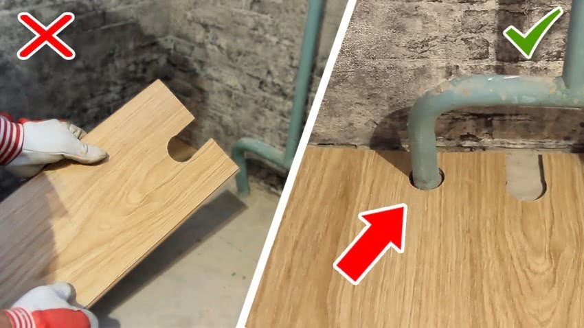 Вывод трубопроводов. Следует снять точные размеры коммуникаций и подготовить под них отверстия. Затем ламель разрезается по их оси симметрии и устанавливается двумя частями. Соединение между ними обязательно надо смазывать прочным клеем по дереву отлично себя зарекомендовал ПВА. Свежий клей тщательно вытирается сухой чистой тряпочкой.