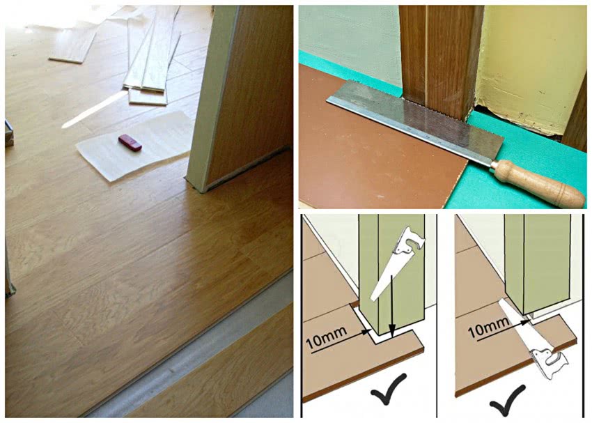 Когда вы соберете первые 3-4 ряда, отодвиньте их от стены и создайте равномерный зазор по периметру покрытия с помощью специальных ограничителей. Сделать их можно и самостоятельно из подручных материалов одинаковой толщины. Когда вы доходите до дверного проема, нужно подрезать ламинат таким образом, чтобы он заканчивался под дверным полотном. Чтобы под дверным наличником не было щели, делайте угол запила в этом месте округлым. Для многих кажется трудной укладка последнего ряда. Так как он, скорее всего, будет сильно широкий, нужно ровно подрезать его с учетом зазора 1 см