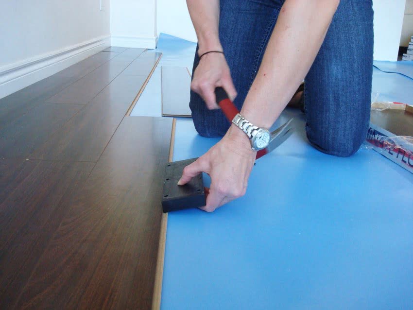 - Стыковка деталей должна быть плотной без щелей. Для уплотнения соединения вы можете постучать по замкам молотком,через специальный добойник. Также его можно сделать самостоятельно из обрезка ламината с замком.