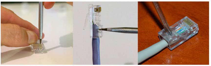 После того, как обожмете все контакты, аккуратно воткните отвертку в фиксатор, чтобы надежно закрепить коннектор на кабеле. Со вторым концом кабеля поступаем точно также. После работы можно заметить, что контакты немного повреждены отверткой, кримпер такого эффекта не дает.