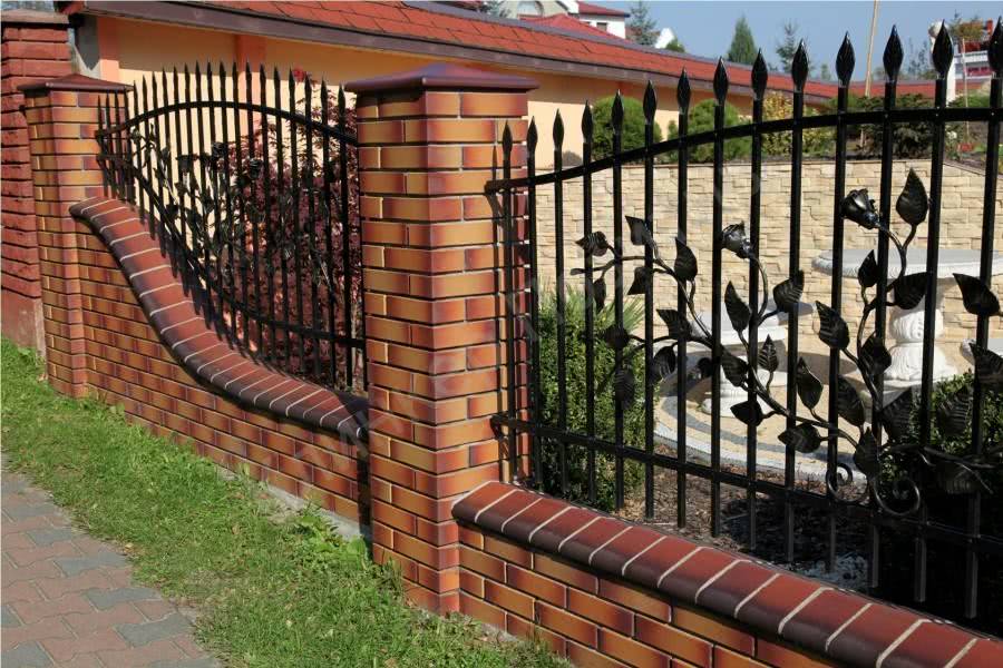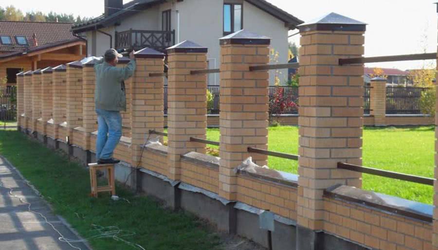 - Установка колонн или столбов из кирпича – один из самых популярных способов при строительстве ограждений. Относительная простота, бюджетность и прочность, высокая степень декоративности, стильность – все это качества, присущие кирпичным опорам, поэтому их предпочитает значительное количество застройщиков.