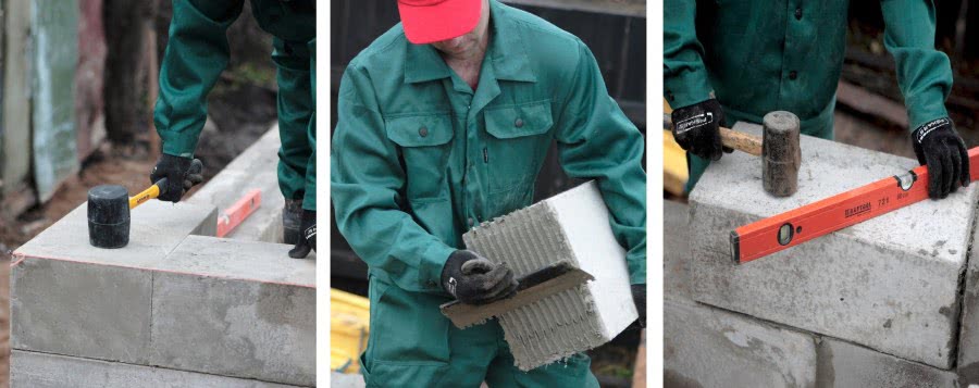 Каждый уложенный блок проверяется по уровню. Его положение корректируется при помощи резинового молотка.