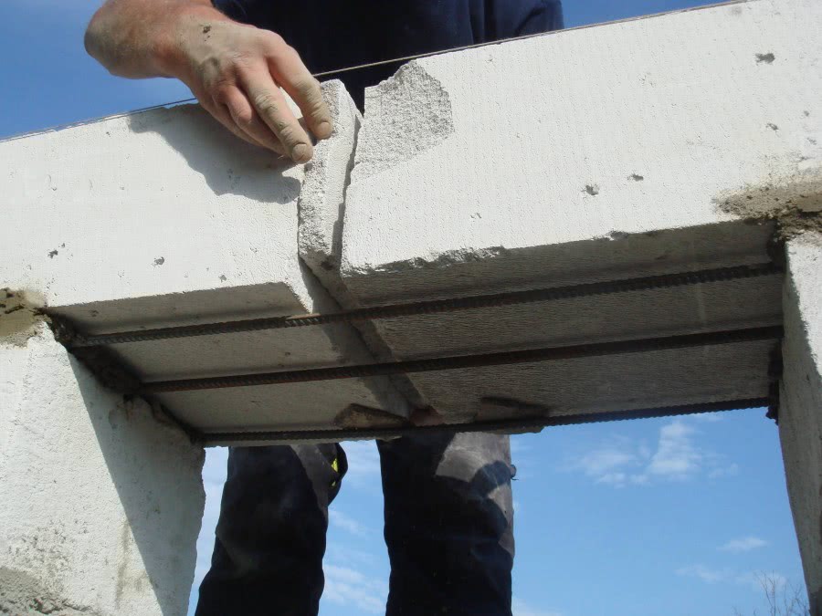 - Когда стены будут выложены на необходимую высоту, сверху последнего ряда блоков нужно залить армирующий пояс из бетона. Он распределит равномерно на все стены нагрузку от плит перекрытия. Если бетонный пояс будет отсутствовать, перекрытие будет давить на отдельные блоки более сильно, нежели на другие. Результатом этого давления будет постепенное разрушение хрупких пеноблоков. Толщина бетонного пояса должна составлять 10–20 см.