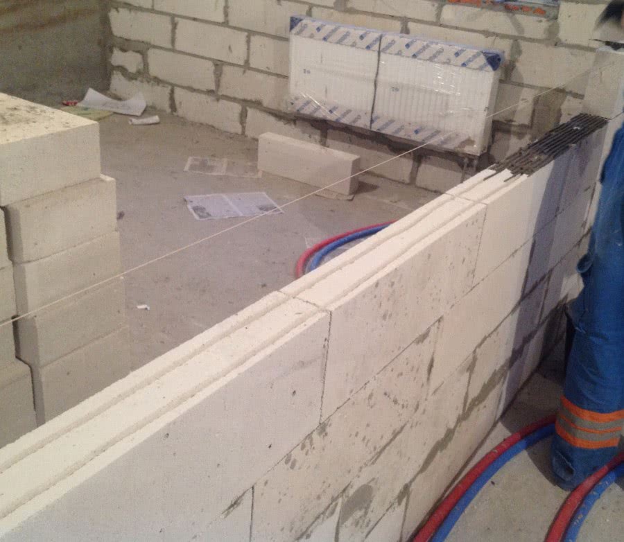 Отсутствие сдвига пеноблоков друг относительно друга. Поскольку стену обычно стену выкладывают в два ряда, то нужно помнить, что внутренний слой должен быть сдвинут относительно внешнего
