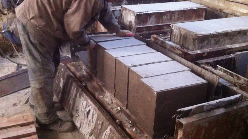 - После завершения начального созревания, монолитный газосиликат извлекают из формы и режут на блоки.