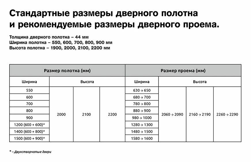 Изделия с указанными высотой/шириной в мм, подходят для установки в типовые проёмы. Межкомнатные двери – размеры с коробкой стандартные, из таблицы, минус 43 мм по высоте и 65 мм по ширине. Для прохода в жилую комнату: 2000/800; кухню: 2000/700; санузел и туалетную комнату: 1900, 2000/550, 600. В больших гостиных рекомендуются одностворчатые с шириной 900 мм или двустворчатые двери 2000/1200.