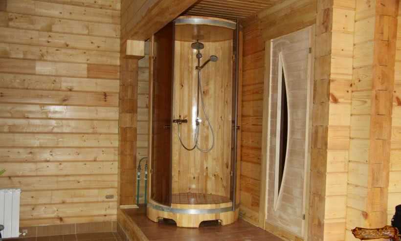 По технике безопасности дверь из парилки должна открываться наружу. В совмещенном варианте парной и душевой два помещения отделяются между собой сплошной стеной с дверью.