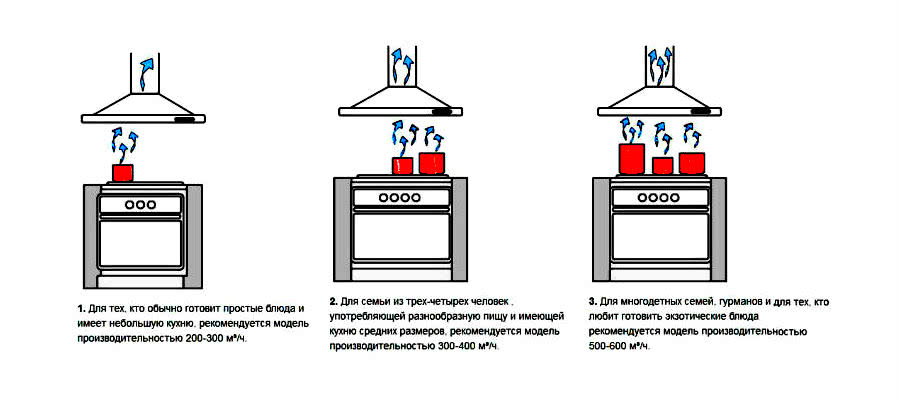 Основной параметр, на который следует ориентироваться, подбирая себе вытяжку — производительность, напрямую связанная с мощностью. Приобрести соответствующее своим вкусовым предпочтениям, но слишком маломощное оборудование – значит, выбросить деньги на ветер, данное решение в корне неверно. При выборе оптимальной вытяжки руководствуются нормами СнИП, в которых указаны следующие параметры: