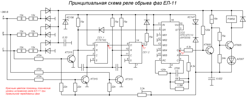 Устройство предназначено для контроля фаз в 3-фазной сети, работает на переменном напряжении 380 Вольт. На практике применяется для контроля наличия U и правильности симметрии.