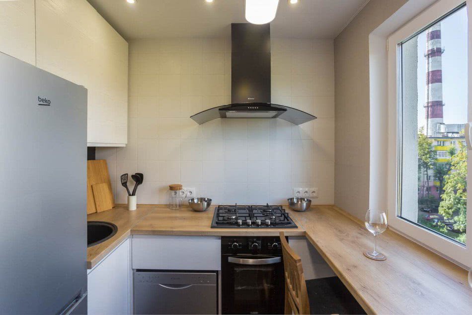 - Преимущество – за рабочей поверхностью. Иначе готовить будет просто неудобно. Полезная площадь должна занимать как можно больше места. Задействуйте подоконник, переоборудовав его в столешницу или обеденную зону.