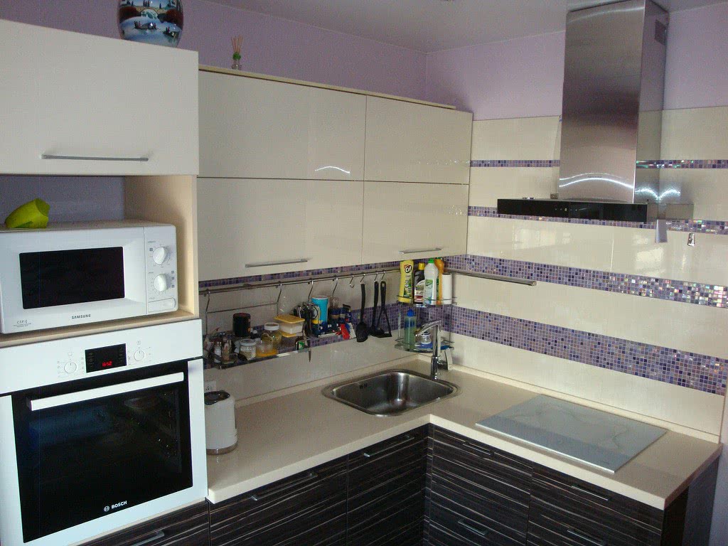 Разнообразить бежевые оттенки на кухне вполне можно ярким фартуком над рабочей зоной. Яркие вставки фиолетового, красного, апельсинового придадут кухне оригинальных акцентов, но выбранные тона нужно применить и в других местах помещения.