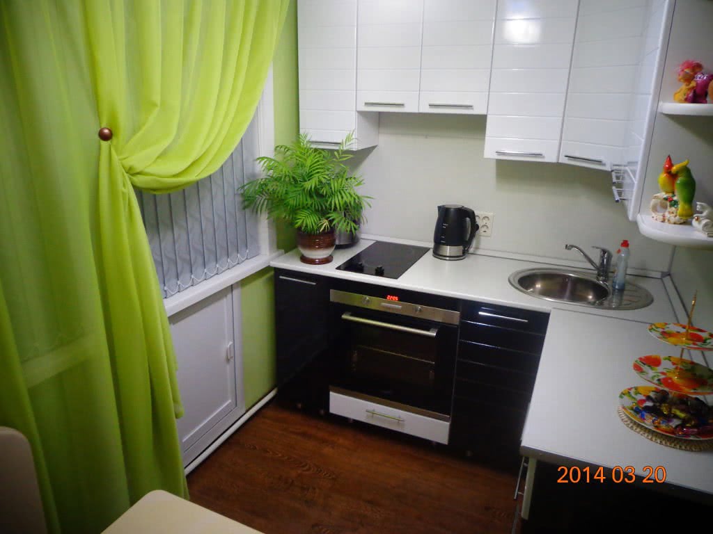 Балкон в рассматриваемых маленьких кухнях также обычно отсутствует, так как не предусмотрен большинством проектов. Единственное что возможно сделать – расширить подоконник или убрать его, заменив шкафчиком со столешницей. Разрешается даже установить на этом месте мойку. На фото с готовыми дизайнами это выглядит несколько оригинально, но вполне практично.