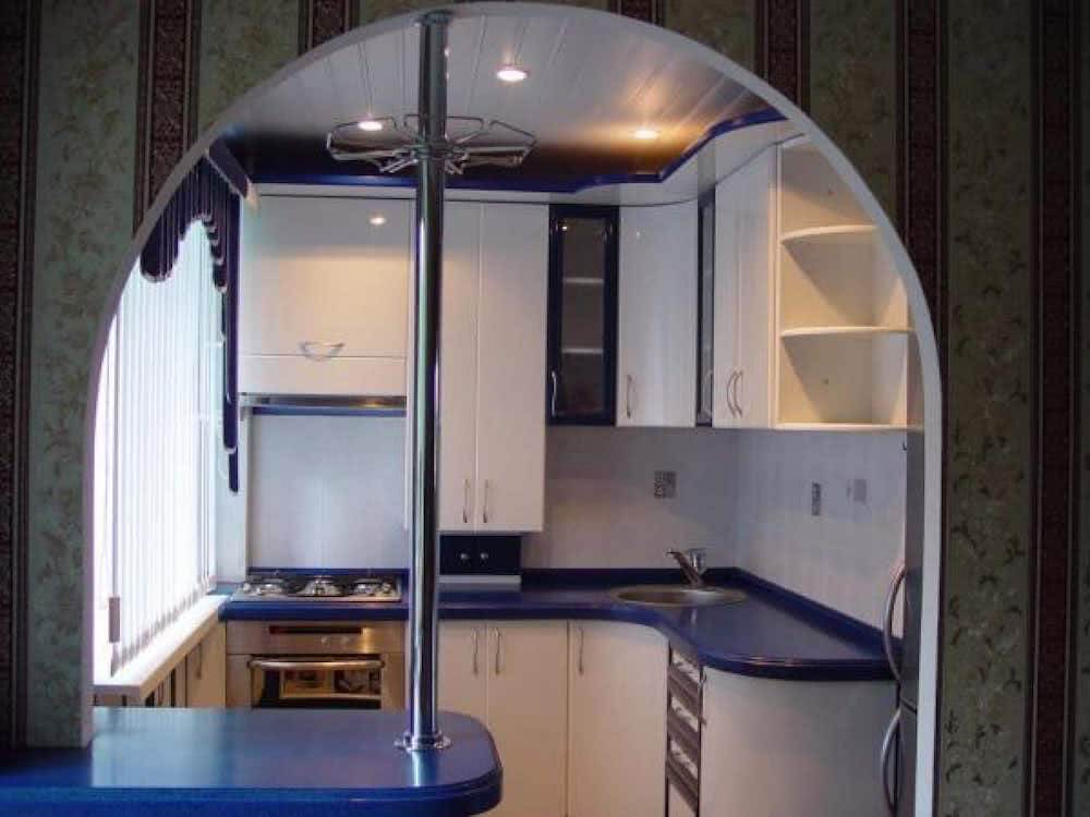 Важно помнить, что на кухне с газовой колонкой обязательно должна присутствовать входная дверь, заменять ее аркой нельзя ни в коем случае (это требование продиктовано инструкцией безопасности)