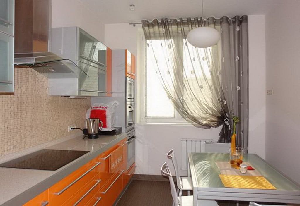 - Обеденную зону или расположить возле противоположной гарнитуру стены или сделать выдвижной из-под подоконника, когда в ней не будет необходимости она легко прячется обратно.