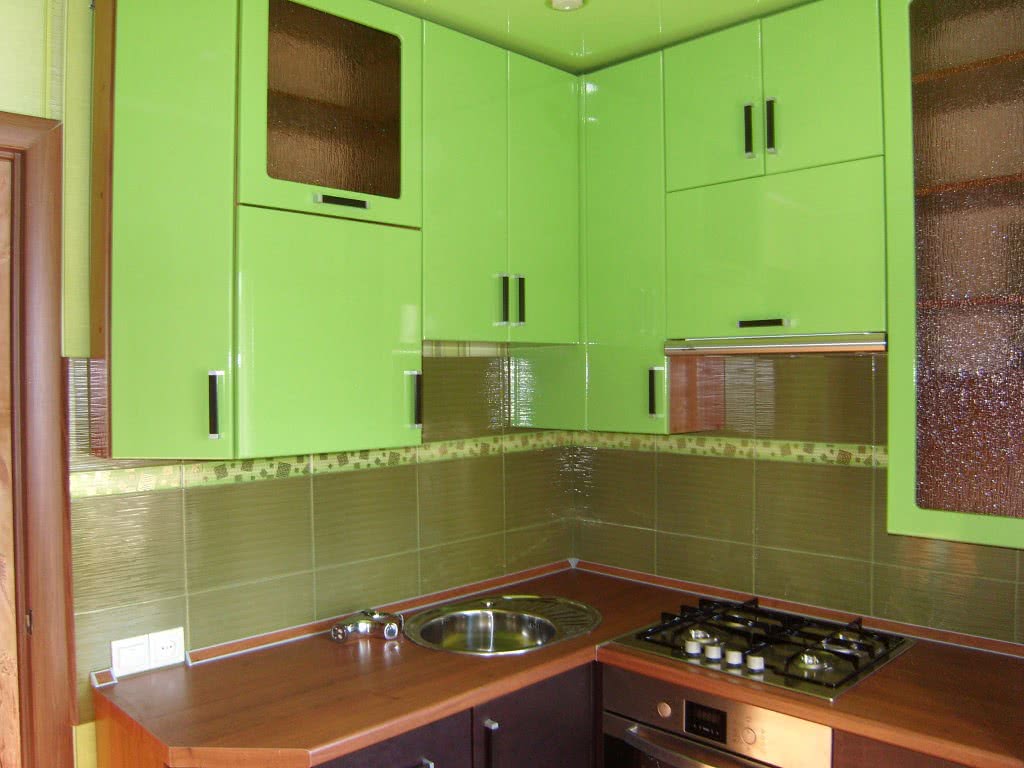 Светло-зеленая с желтым подтоном. Такое сочетание смотрится свежо, ярко и не скучно. Позволит преобразить небольшое помещение и сделать его визуально светлее. Фасад кухни салатового оттенка можно комбинировать с ярко желтым фартуком, украшенным красивыми изображениями цветов, фруктов. Приветствуется на отделке стен использование вертикальных линий с разной шириной.