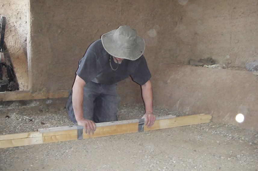 - Далее делаем гравийную отсыпку. Это – теплоизоляция в вашем полу. Землю следует очистить от растений, чтобы не проросли через пол. После этого, вбить колья, так, чтобы их уровень не доходил до уровня будущего пола на 100 мм. Отсыпка начинается от стенки, находящейся напротив двери. После засыпки всей площади, гравий разравнивается и утрамбовывается, а колышки удаляются.