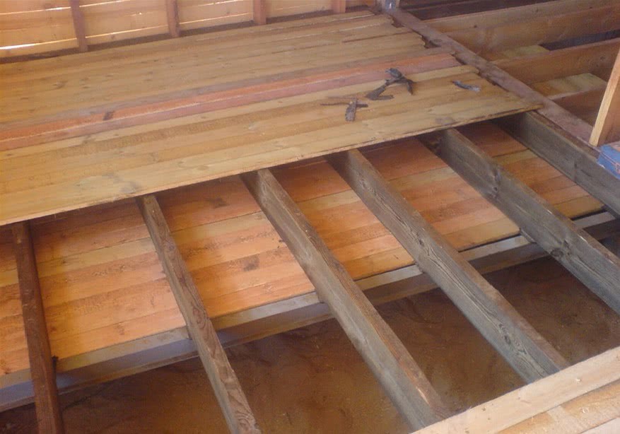 Если черновой пол мешает этому, то необходимо удалить доски, находящиеся рядом с лагами. Это трудоемкая работа, но она сможет дать полную картину состояния лаг.