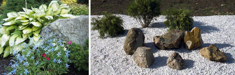 - Большие валуны нужно частично вкопать в почву – так они будут более устойчивыми. Пустоты под ними можно заполнить мелкими камешками и песком.