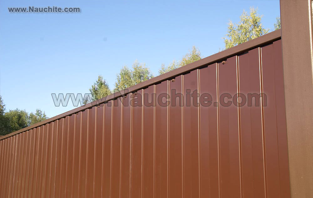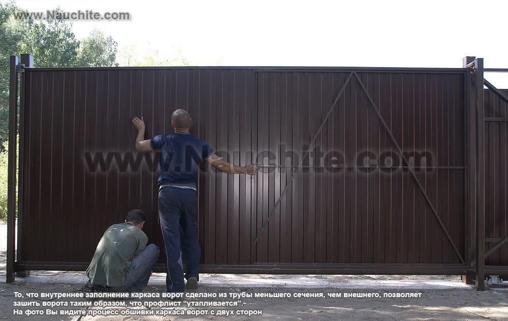 - Полотно ворот. Основная рама с приваренным к ней внутренним каркасом и противовес установлены на несущей нижней балке. Облицовка забора, которую чаще всего делают с использованием листов профнастила, закреплена на каркасе с одной или с двух сторон.