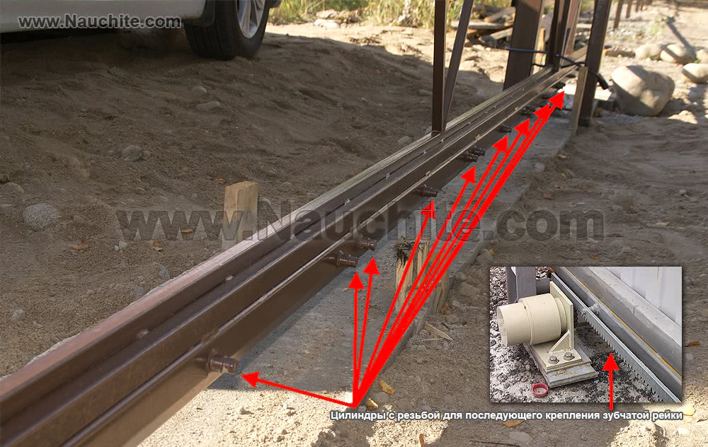 К каркасу лучше сразу приварить зубчатую рейку (либо цилиндры с резьбой под крепление зубчатой рейки). Крепления зубчатой рейки (цилиндры с резьбой, 3шт на 1 метр рейки) стандартно идут в комплекте с ней. Обязательно проверяйте этот факт при покупке! Чтобы автоматику без проблем потом поставить. Иначе потом будет крайне неудобно её ровно приваривать к самому низу ворот. Её длина должна быть минимум на 1 метр больше, чем длина проема. Этот 1 лишний метр (или более) зубчатой рейки выступает на «противовес» ворот для того, чтобы быть всегда в зацепе с зубчатым колесом двигателя привода ворот. Зубчатая рейка универсальна и подходит под 99% приводов (САМЕ, NICE, Дорхан, Алютех и т.п.). Если приваривать цилиндры с резьбой для последующего крепления зубчатой рейки, то лучше их приварить заблаговременно к направляющей (направляющему рельсу) как показано на двух фото ниже.