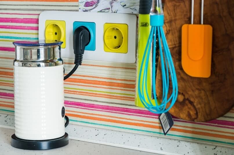 Чтобы определиться с количеством розеток на кухне, необходимо просуммировать все бытовые приборы, которые планируется эксплуатировать, и прибавить ещё 20% в качестве запаса. Наиболее распространёнными кухонными потребителями являются: