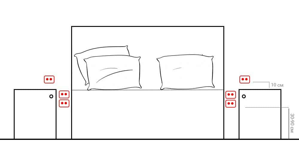 - Если размеры кровати и прикроватных тумб еще не известны, то можно выбрать двугнёздные розетке, расположенные на 15 см выше пола.