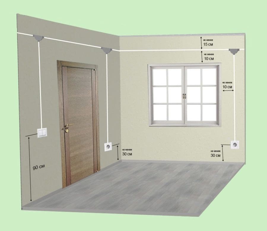 Рядом с дверью должен находиться выключатель общего освещения и одна розетка для подключения пылесоса и другой мелкой бытовой техники. Расположите их со стороны ручки закрытой двери и убедитесь, что они не будут спрятаны за мебелью. Стандартная высота от выключателя до пола — 75-90 см, розетки — 30 см от пола и 10 см от дверного проема.