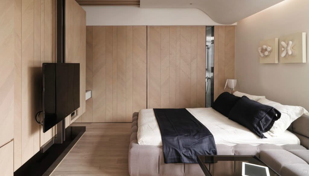 Важно учесть количество и расположение всех устройств, которые будут находиться в спальне — от настольной лампы до утюга, прилагающегося к вмонтированной в гардероб гладильной доски.