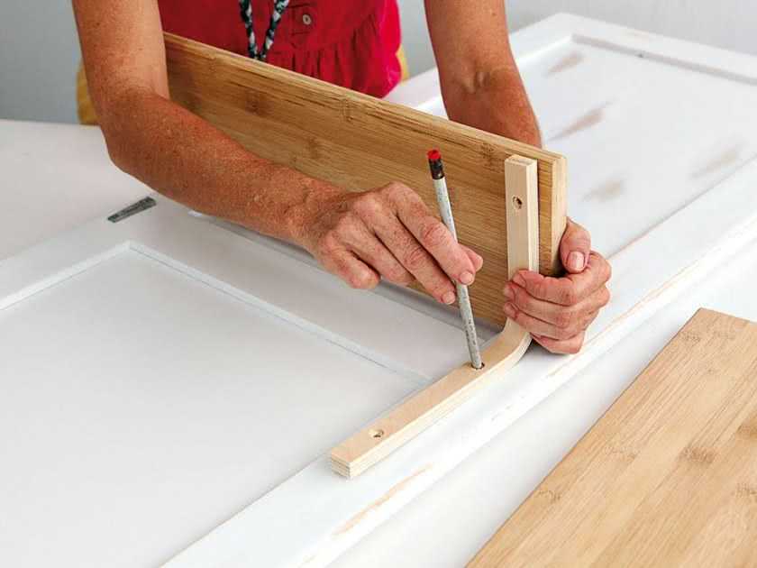 Сначала закрепите доску на стене на уровне будущей столешницы. К доске приверните саморезами дверные петли. Столешницу закрепите на дверных петлях так, чтобы она опускалась вниз. В поднятом виде она будет удерживаться ножками.