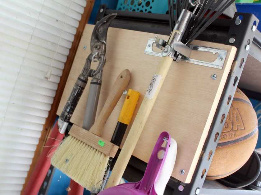 Очень полезным оказывается гараж для хранения садовых принадлежностей, если конечно позволяет место, т.к. не всегда на загородном участке отводят специальное помещение для таких вещей. На фото ниже показано, как легко это сделать при помощи планок и крючков.