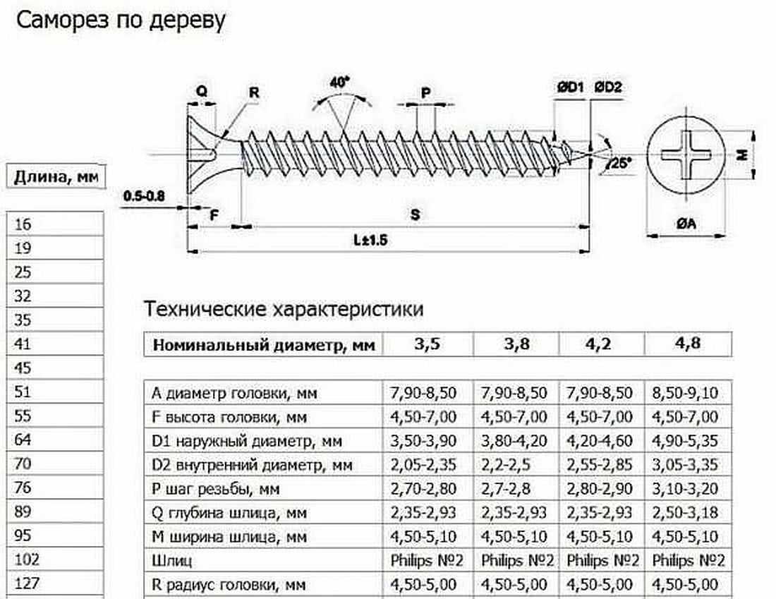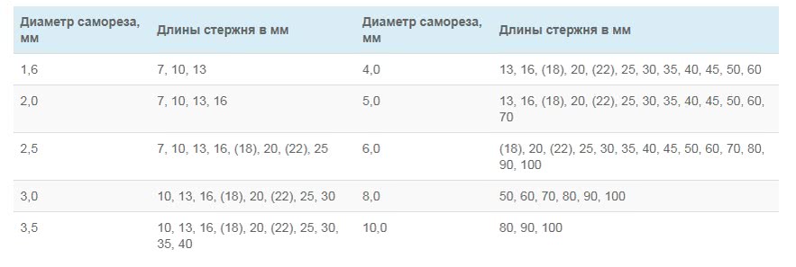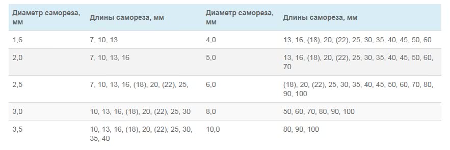 Теперь сравните две таблицы. Они составлены по разным ГОСТам. Как видите, диаметры и длины совпадают. Вот это и облегчает жизнь. Если при производстве крепежа придерживались стандарта и по соотношению диаметра/длины, то все просто. Если же нет, то производитель в описании саморезов прикладывает таблицу с размерами (как на рисунке выше).