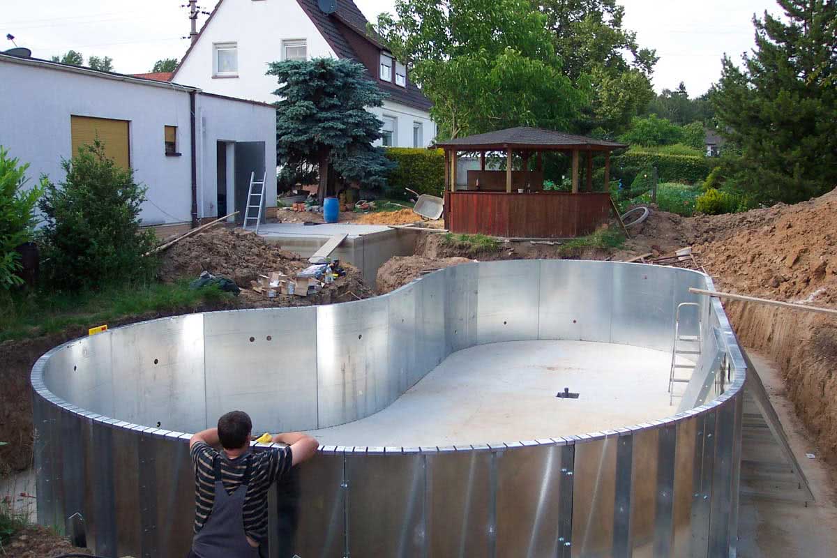 Коробку бассейна льют цельной из бетона, притом наружные подпоры, удерживающие щиты опалубки зачастую даже не снимают и забрасывают обратной отсыпкой
