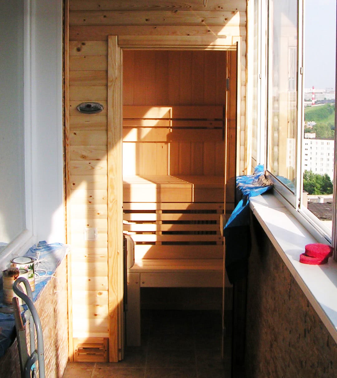 - застеклённая лоджия или просторный балкон, здесь потребуется дополнительное утепление, чтобы можно было комфортно использовать парную и при низких температурах. Вентиляцию, как правило, выводят на улицу;