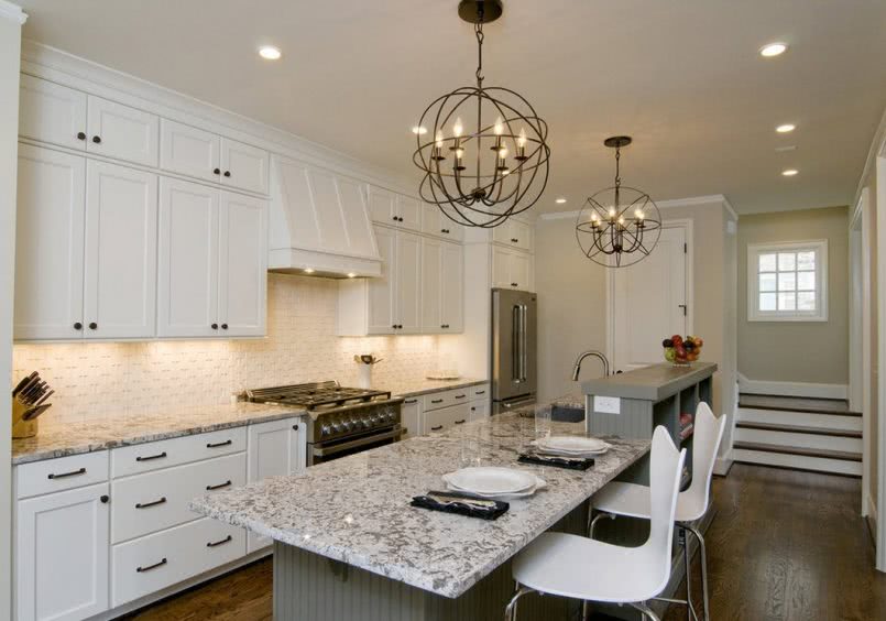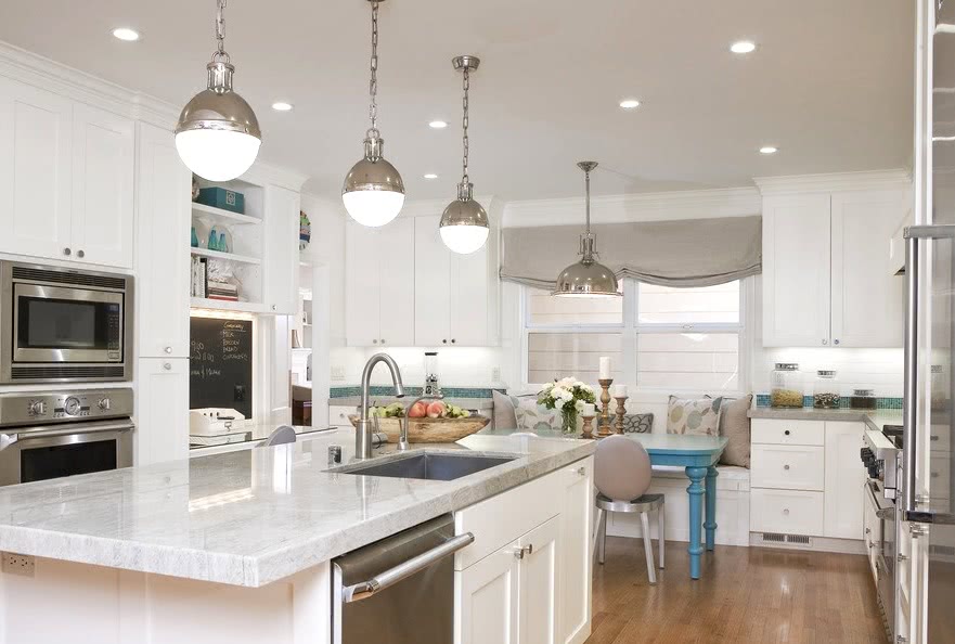 - На кухне делается общее освещение с помощью люстры. Над обеденной зоной проще всего расположить один или несколько плафонов направленного света. А для подсветки рабочей зоны стоит закрепить светодиодную ленту на нижней части навесных шкафчиков.