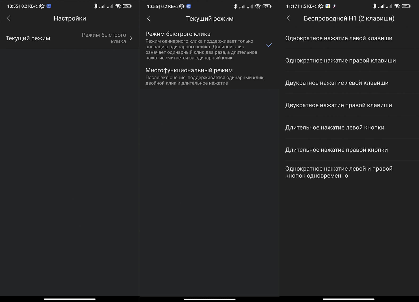 Распознается одинарное, двойное и тройное нажатие на клавишу, а так же дополнительное, седьмое действие по одновременному нажатию на две кнопки сразу.