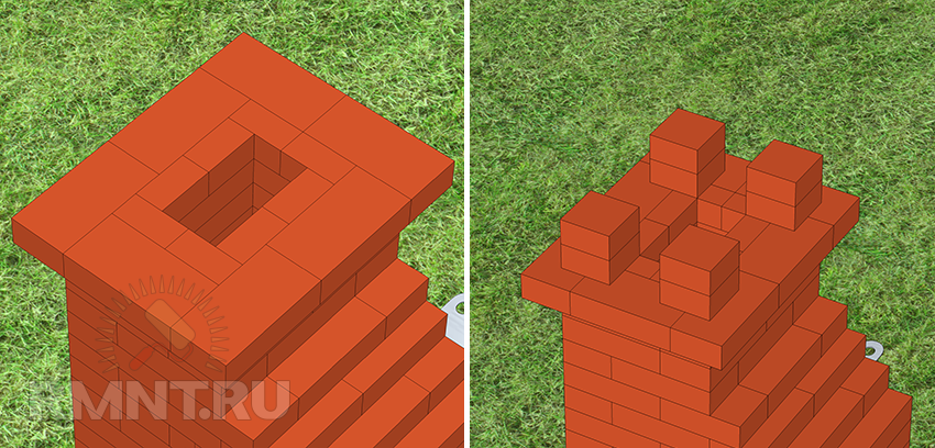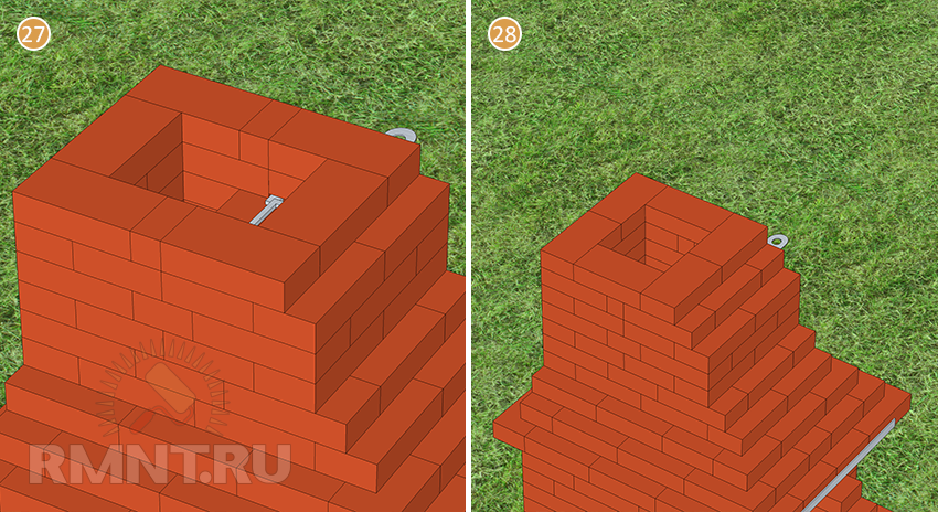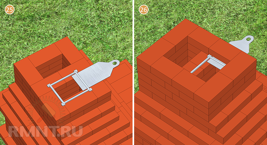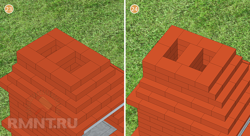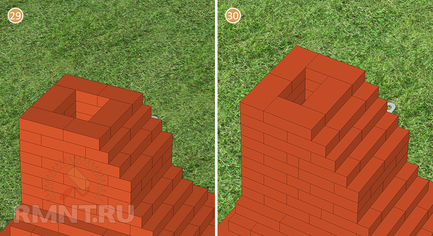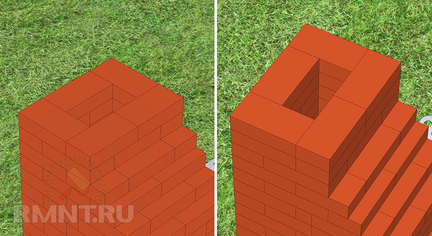 После того как проем закончен, выполняют еще 2 ряда, затем начинают кладку трубы. Для этого с каждым рядом сокращают длину стен: переднюю и заднюю стенки уменьшают на ½ кирпича, боковые – на четверть ширины кирпича. Выполняют так 7 рядов. Следующие 12 рядов – дымоотводящая труба, ее делают прямоугольной.