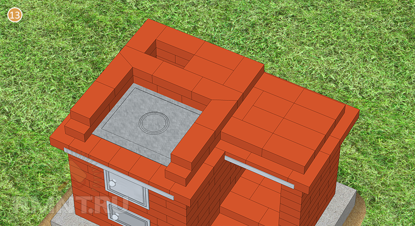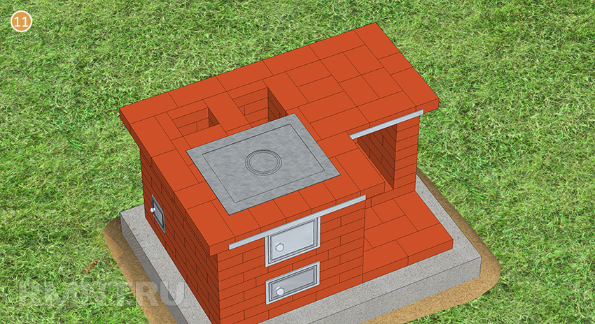 При устройстве свода над варочной плитой кирпич устанавливается на стальные уголки. Также на уголки укладывают решетку-мангал или чугунную плиту. Канал дымохода для садовой печи-барбекю можно делать 270х140 мм, 270х270 мм, а также 400х140 мм. Внутреннюю стенку дымохода необходимо оштукатурить, чтобы она была ровной и не давала копиться в неровностях копоти.