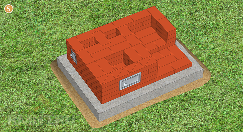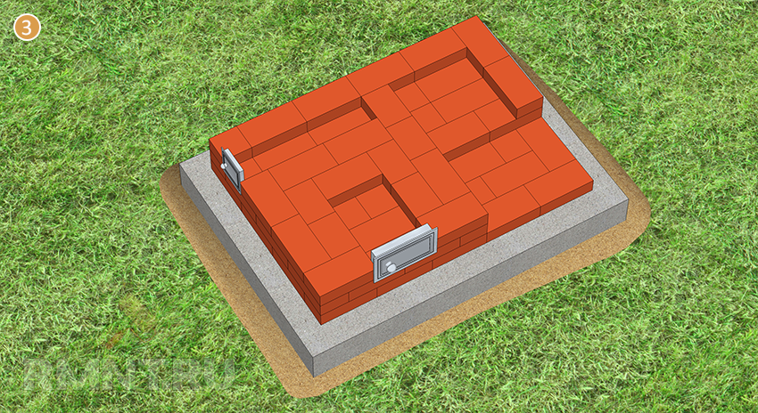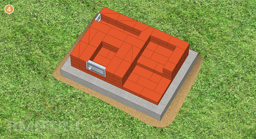 Кирпичные печи барбекю возводят на фундаменте или бетонном основании. Перед тем как начинать кладку, фундамент гидроизолируют с помощью двойного слоя рубероида. Для возведения конструкции такого типа потребуется примерно 1200 огнеупорных шамотных кирпичей. Кладут их на жароустойчивую смесь «Геркулес», выдерживая толщину шва в 5–7 мм.