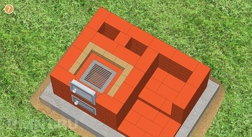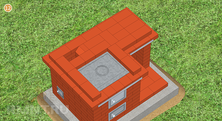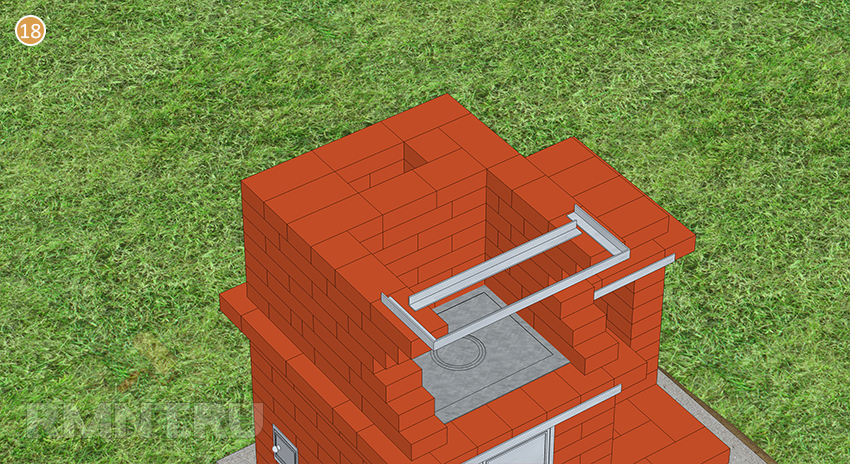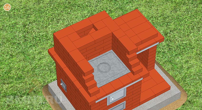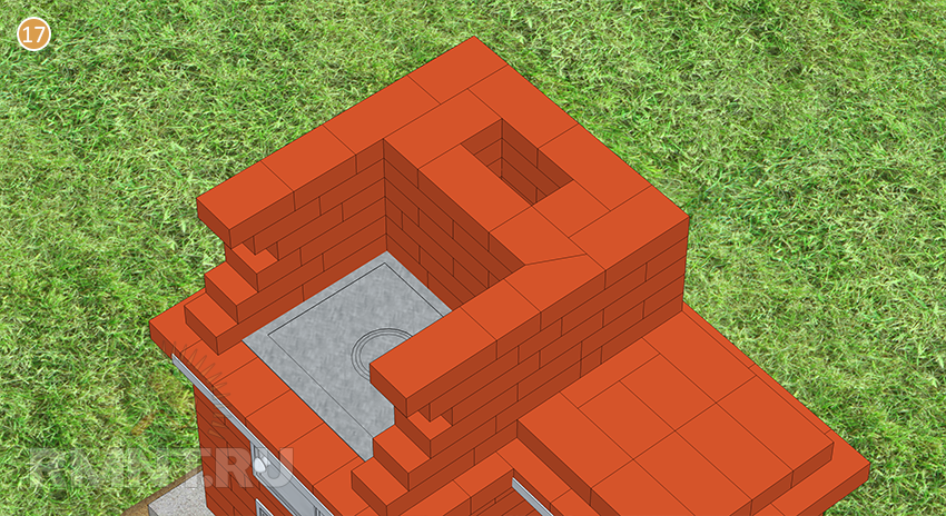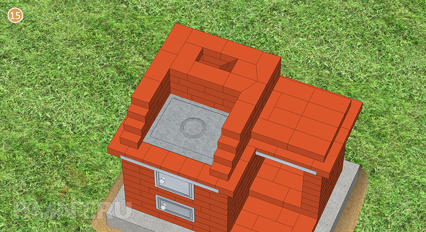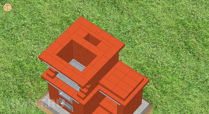 Трубу печи-барбекю возводят, используя шамотный кирпич, который кладут на глиняный раствор. При выполнении рядов длину сторон топки сокращают. Когда длина сократится до нужного размера, кладут около 12-14 рядов.