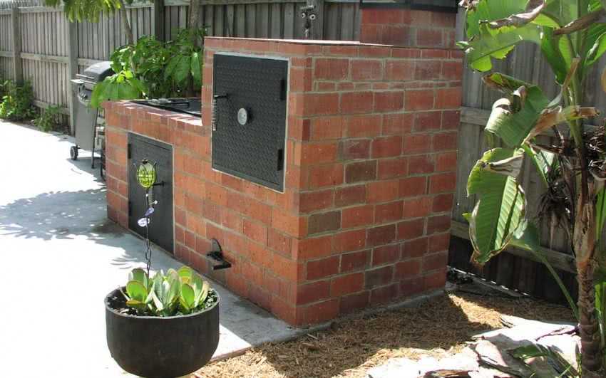Под печью барбекю из кирпича обычно понимают довольно сложное сооружение. Оно обязательно включает в себя место для углей с держателем решетки над ним, дополнительные поверхности для раскладки/разделки продуктов. Часто в конструкцию включают также полки/ниши для дров, мойку, варочную поверхность (обычно с отдельной топкой), коптильню и так далее.