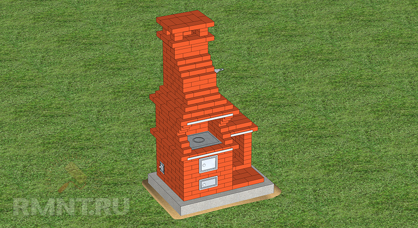 В основе простого уличного мангала-барбекю и печкой под казан лежит Ш-образная конструкция с отличием от предыдущей в том, что на месте стола размещается печь. Для печи понадобится колосник, дверца и накладка с кольцами.