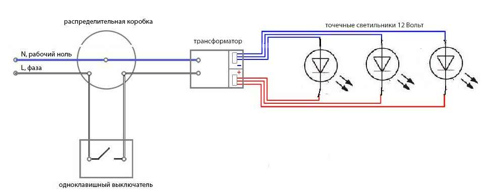 Схема параллельного подключения точечных светильников 12В через трансформатор.