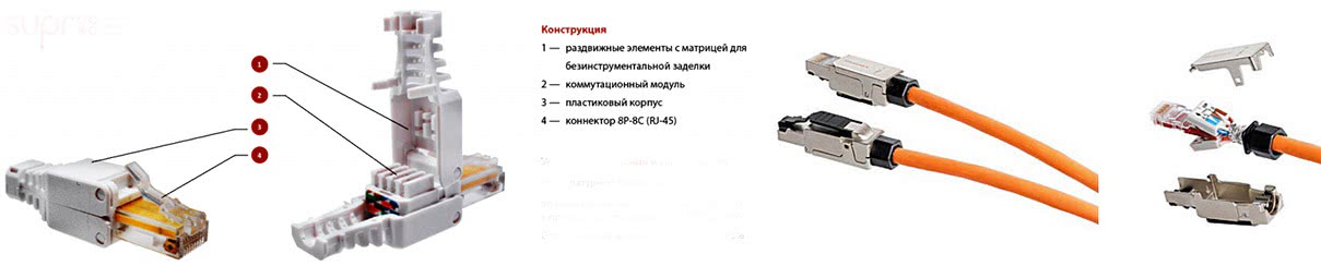 Существуют коннекторы для которых клещи не нужны. Здесь необходимо просто пальцами хорошо нажать и все. Правда, цена на такой штекер совсем не маленькая. Поэтому стоим задуматься, стоит ли оно того. Принцип обжатия прост, каждую жилу заводим сверху в пазы, после того как все провода уложите, закройте плотно обе половинки корпуса. Производит такие коннекторы фирма «Nikomax», а в России «СУПР».
