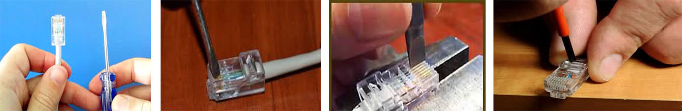 Способ с отверткой, нужно заметить «варварский», но работает. Правда, не всегда получается хорошее качество прессовки, в результате чего отмечается нестабильность работы сетевого кабеля