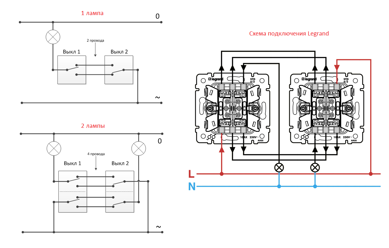 Компания Легранд занимает лидирующую позицию на рынке электротоваров. Востребованность проходных выключателей Legrand обусловлена высоким качеством исполнения изделий, простотой монтажа, удобствами в дальнейшей эксплуатации, стильным дизайном и гибкой ценовой политикой. Единственным недостатком является необходимость в подгонке установочного места. Если оно не будет совпадать с изделием, могут возникнуть трудности при его монтаже, который выполняется согласно схеме подключения проходного выключателя Легранд.