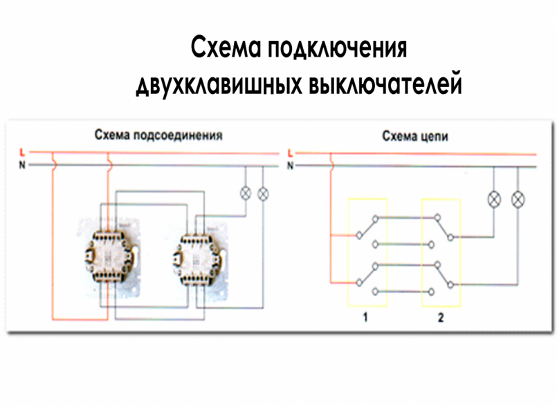 Этот провод подключается к корпусу светильника. Инструкции Cхема подключения двухклавишного проходного выключателя переключателя Двухклавишный проходной выключатель представляет собой объединенные в одном корпусе два одиночных проходных переключателя. Давайте сначала рассмотрим схему подключения одноклавишного перекидного выключателя, а затем — двухклавишного.