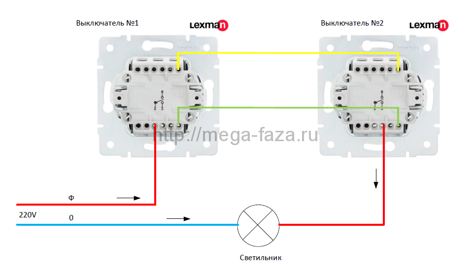 Подключение проходного выключателя со схемой управления из двух точек
