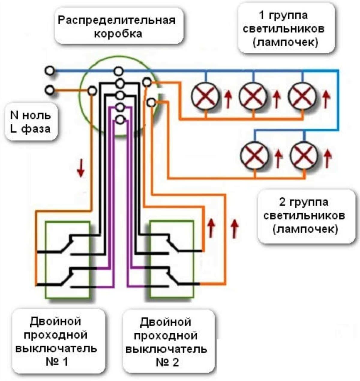 Схема подключения проходного выключателя — переключателя.