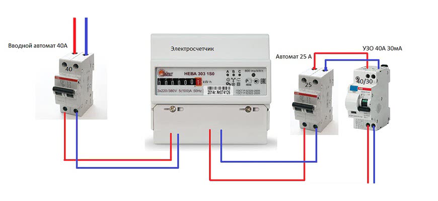 - Со стороны ввода устройства устанавливают в таком порядке: главный автомат, счетчик, селективное УЗО (с задержкой срабатывания). Первый аппарат должен иметь конструктивные элементы для опломбирования.